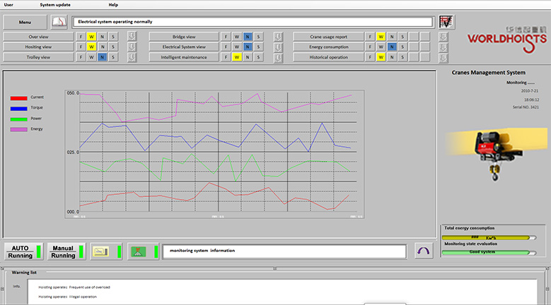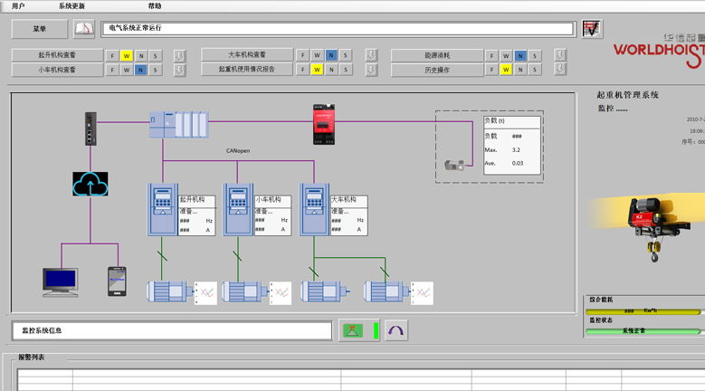 程控制,包括防沖擊、電子防搖、寸動(dòng)、微速等智能控制 安全監(jiān)控和故障自診斷系統(tǒng) 包括起重機(jī)狀況監(jiān)控、故障報(bào)警、數(shù)字化檢修和視頻實(shí)況